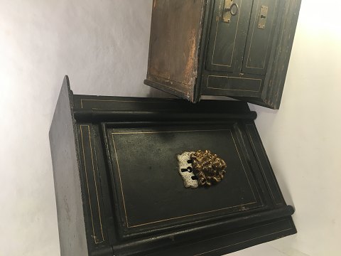Old unique safe in miniature. standing on wooden shelf. with 2 drawers.