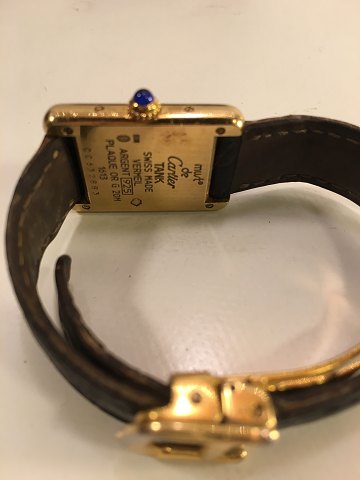 Damearmbåndsur fra Cartier, model Tank, i kasse af forgyldt sterlingsølv, lys cremefarvet skive m. romertal, optrækskrone prydet m. carbochonsleben safir, mineralglas, monteret m. original brun Cartier læderrem med forgyldt spænde, quartz urværk. Ø. 27,9 x 23,5 mm.