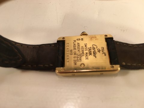 Damearmbåndsur fra Cartier, model Tank, i kasse af forgyldt sterlingsølv, lys cremefarvet skive m. romertal, optrækskrone prydet m. carbochonsleben safir, mineralglas, monteret m. original brun Cartier læderrem med forgyldt spænde, quartz urværk. Ø. 27,9 x 23,5 mm.