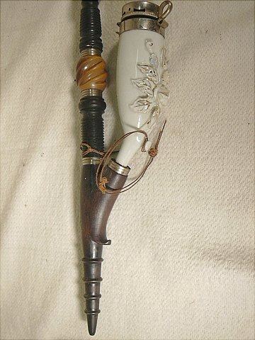Flot gammel porcelæns langpibe med sølv beslag og blomster dekoration.