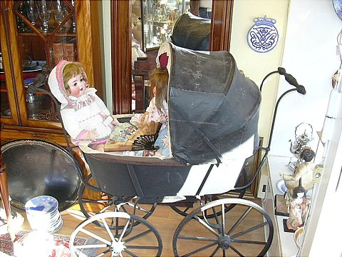 Gammel barnevogn med original kaleche fremstår med alders betinget slitage.