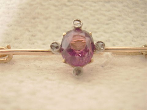 14k guld med oval brillantslebet amatyst / korund ca 1 ct og 4 diamanter 0,04 ct