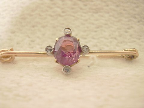 14k guld med oval brillantslebet amatyst / korund ca 1 ct og 4 diamanter 0,04 ct