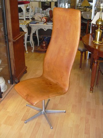 Arne Jacobsen. Oxford stol betrukket med patineret cognacfarvet skind , stel med fempas fod af Aluminium. Fremstillet hos Fritz Hansen
