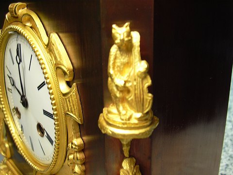 Fransk kaminur af Lueforgyldt og patineret bronze, på urhus kvinde med kastagnetter og fløjtespillende mand, på urets sider kat og abe med musikinstrumenter, Skive af hvid emalje med små afslag og hårrevner. Værk stemplet Japy Freres Medaille D'Or og E et Cie. anno 1800 tallet begyndelse
