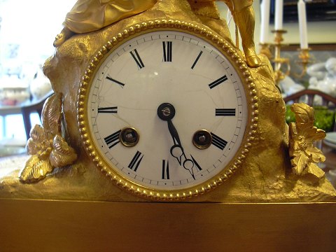Fransk kaminur, 1800-tallet af forgyldt bronce. urhus med pige og dreng ,Skive af hvid emalje med romertal. Urskive fremstår med alderslid i emalje. H. 38 B. 27 cm.