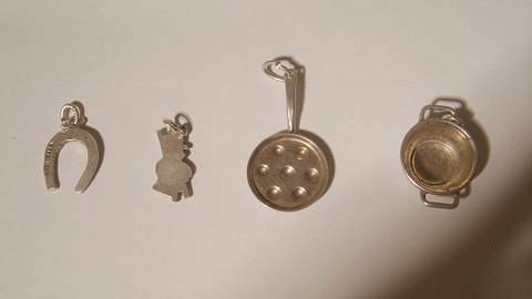4 vedhæng i sølv hestesko , skorstensfejer . pande og gryde
