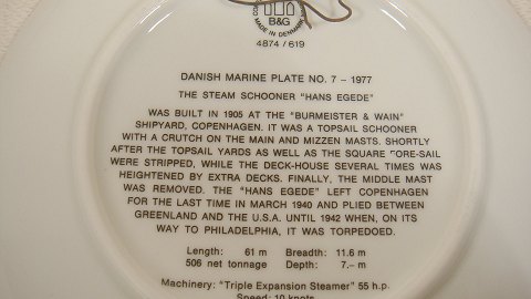 Bing & Grondahl. B & G. Ship Plate Steam schooner Hans Egede 1905 - 1942 Contact for price