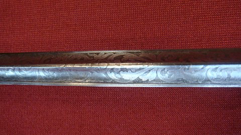 Flot Dansk Embedsmands kårde fæste i forgyldt og med perlemorsbesat fæste og dekoretet i klinge