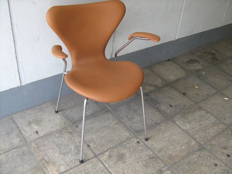 Arne Jacobsen. Armstol 3207 7'er med stel af forkromet stål. Fremstillet hos Fritz Hansen. Nybetrukket med Valnødfarvet elegance læde