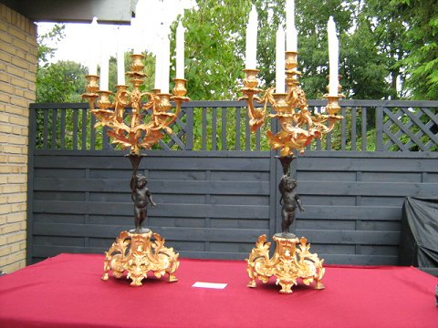 Kandelabre af patineret og forgyldt Bronze stamme med putti som holder 7 slysarme 2 stk