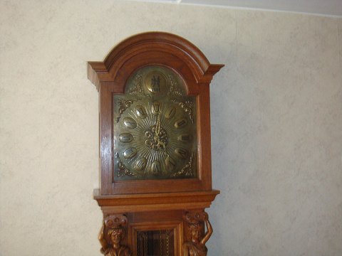 In oak grandfather clock with brass dial year 1908 Height: 225 cm, D: 29 cm Width: 50 cm at the widest point.