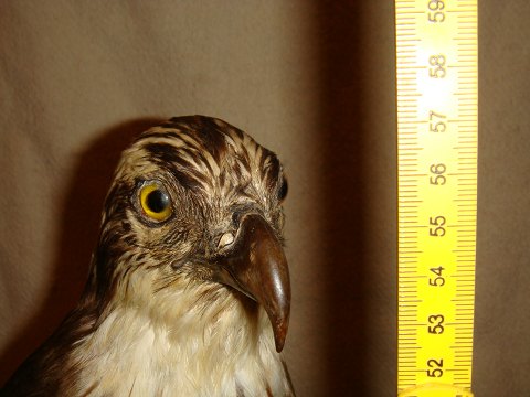 Udstoppet fiskeørn på stand med kranie. Aquila chrysaetos