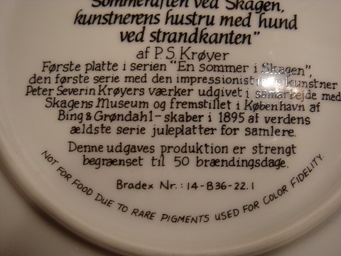 Collector Series Skagenmaler (B & G 1986platte No 4 Sommer-Abend bei Skagen kunstnerns Frau mit Hund strandkantP.S. Krøyer erste Platte in der Serie an einem Sommerabend in Skagen, arbeitet die erste Serie mit impresionisiske Künstler Peter Serverin Krøyers. Veröffentlicht in Zusammenarbeit mit der Skagen Museum und machte in Kopenhagen von Bing & Gröndahl. creator 1895 der weltweit älteste Reihe von Weihnachts-Platten für samler.Denne Thema Produktion ist streng auf 50 Brenntage begrenzt.