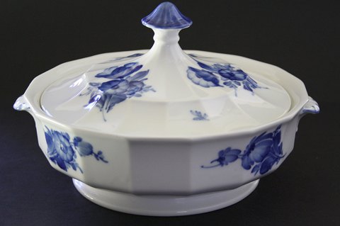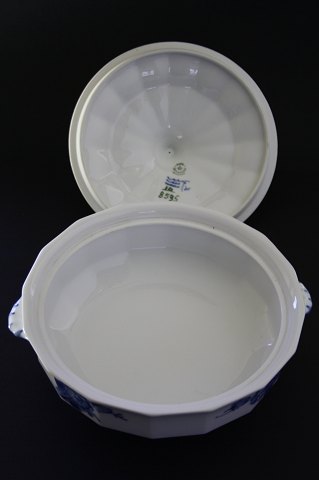 Royal Copenhagen, Blå blomst kantet, Lågfad, terrin med låg og ører. Nr. 8535. Højde 15 cm. Diameter 25 cm. I. sortering. Der forekommer dog 2 sorte brændingsprikker, selvom det er I. sortering, se ekstra fotos. Pris: 1575 kr.