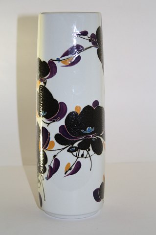 Høj vase med blomster, Kgl. kunstfajance, Royal Copenhagen. Dek. nr. 954/3764. Højde 28 cm. 8x8 cm. øverst, 1. sortering. Pris: SOLGT