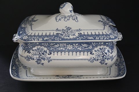 Stor Terin med ører, låg og underfad. Terrin højde med låg 19,5 cm. I låget er der hul med plads til suppeske. Højde uden låg 11 cm. Længde 30 cm. Bredde 19 cm. Der er misfarvet krakelering se ekstra foto. Underfad 32 x 25 cm. Der er et lille kantafslag på underfadet, samt misfarvet krakelering. Pris: 475 kr.