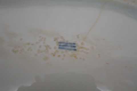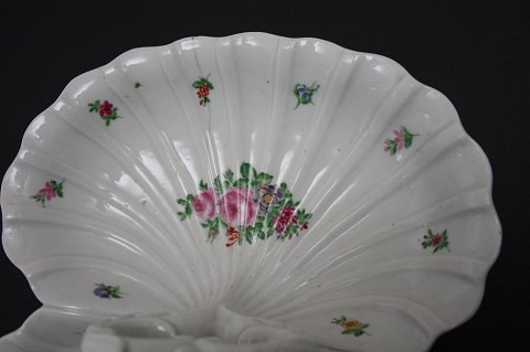 Den Kongelige Porcelænsfabrik, smuk dobbelt porcelænsassiet med hank fra perioden 1830-1845. Håndmalede blomster ovenpå glasuren. Den har lidt brugsslid, samt en hårevne se foto 2. Længde 31 cm. Bredde 25 cm. Højde 12 cm. Pris: SOLGT