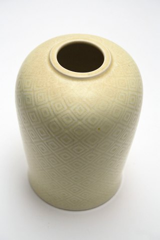 Aluminia, Marselis, kunststengods designet af Nils Thorsson i perioden 1953-1960. Vase i gullig/cremet mat glasur med rudermønster. Dek. nr. 2634. Højde 17 cm. Diameter 12 cm. God stand.