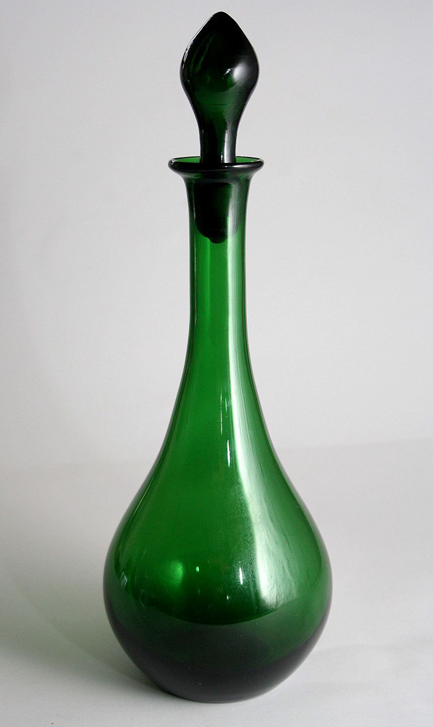 Grøn dråbe karaffel, kugle slebet i bunden, højde 24 cm. hel og fin stand, Pris SOLGT