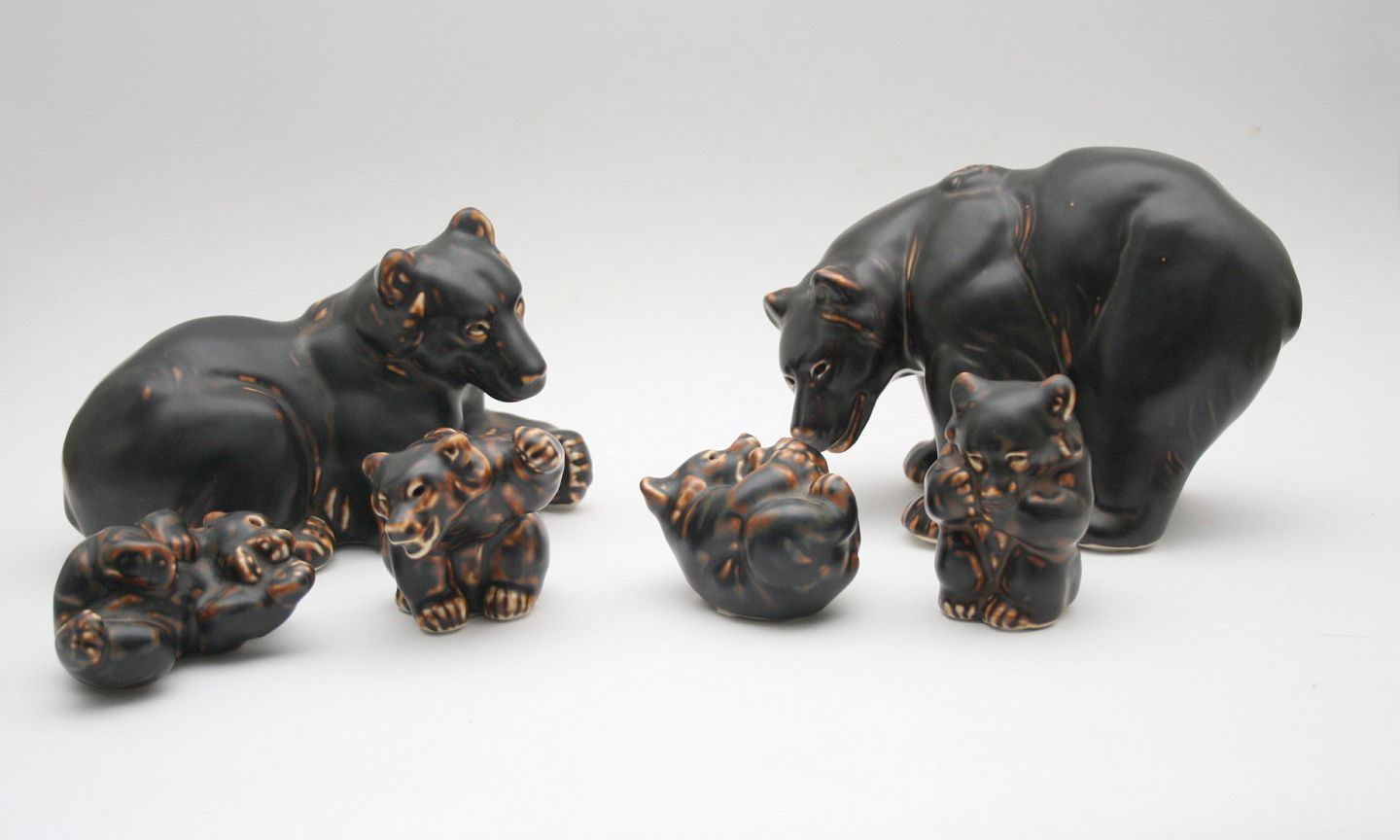 Royal Copenhagen, stoneware, brun glasur. Bjørnefamilie formgivet af Knud Kyhn.