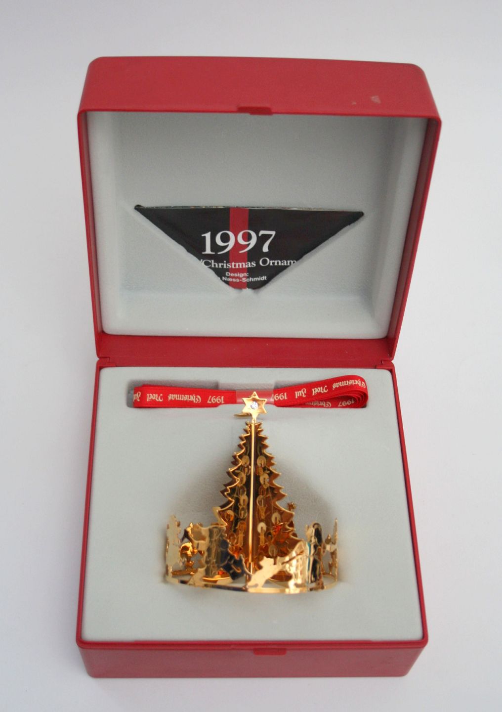 Georg Jensen, juleuro 1997, Juleglæde designet af kunstner Finn Næss-Schmidt. Juleuroen er udført i messing belagt med 24 karat guld. Originalt rødt silkebånd og gaveæske medfølger. Pæn og velholdt stand. Pris: SOLGT