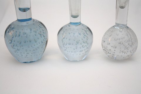 Holmegaard, Orkidévaser. Tv. Blålig tone. Højde 30 cm. Pris: SOLGT Midt. Blålig tone. Højde 20 cm. Pris: SOLGT Th. Klar. Højde 15,5 cm. Lettere kalk/snavs indvendig. Pris: SOLGT