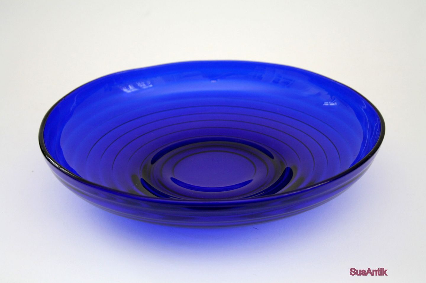 Holmegaard, Broksø presset glas 1938-1941, designet af Jacob E Bang. Mørkeblå flad skål. Diameter 25 cm. Højde 5,2 cm. Pris: