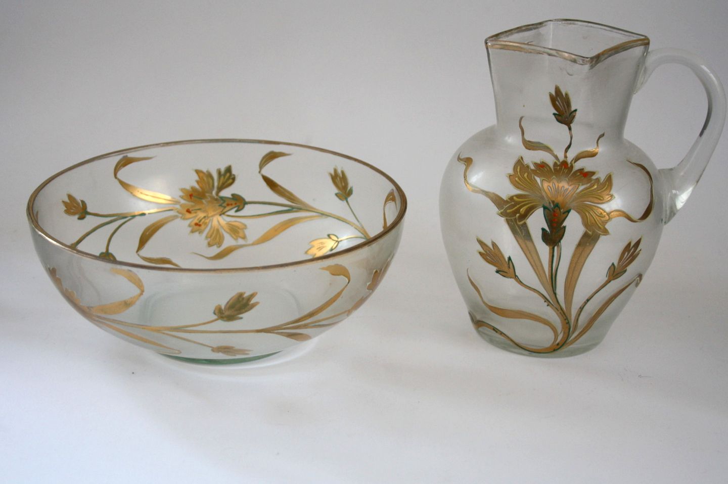 Jordbærsæt i mat glas med guldkanter. Der er påmalede blomster i guld, hvid, rød og grøn.