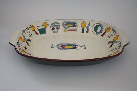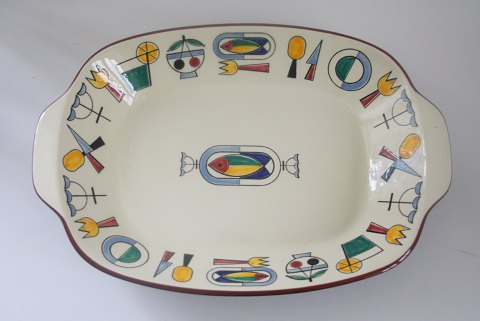 Stående fad bagerst. Lettere krakeleret. 36x23 cm. Højde 5 cm. afslag bagpå se ekstra foto, samt lille kantafslag. Pris: SOLGT