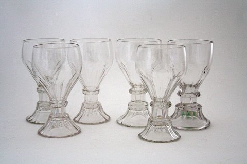 Strömbergshyttan, Vinglas med facetslibning påsat mellemstykke, rigler og trompetfod designet af Gerda Strömberg. Glassene er gamle og har brugsslid i form af udvendige ridser. Højde 12 cm. Diameter 6,2 cm. Pris: 675 kr. Samlet 6 stk