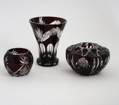 T.h. Krukke/vase med drueklaser og blade. Højde 10,5 cm. Øverste diameter 7,3 cm. Lettere brugsslid. Pris: 450 kr.