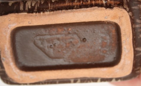 T.h. Firkantet vase i brunmeleret mat glasur med relief mønster og orange glasur. Strehla. Højde 21 cm. SOLGT