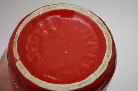 T.v. Flad rund vase orange glasur, sort mat glasur i bund. Hutschenreuter (HK). Højde 10,5 cm. Midterste diameter 15 cm. Pris: 450 kr.