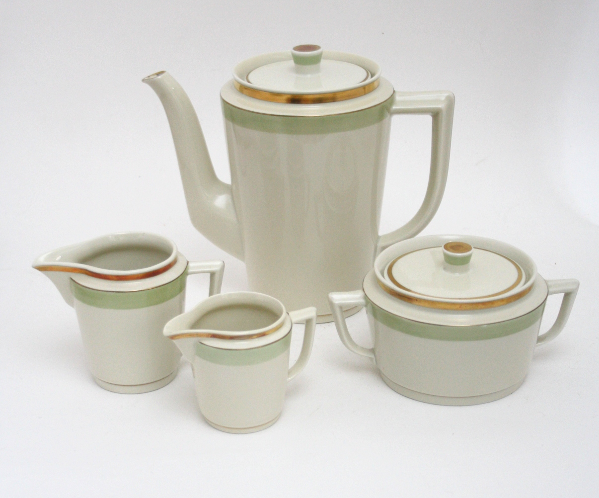 Royal Copenhagen, Broager. Cremet stel med lysegrøn bort og guldkanter. Dek. nr.1236. 2. sortering.