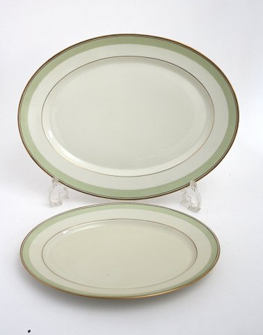 Royal Copenhagen, Broager. Cremet stel med lysegrøn bort på fane og guldkanter. Designet af Thorkild Olsen. Suppeterrin med låg med hul til ske. Nr. 1236/9576. Højde 18 cm. Diameter 24 cm. Længde 27 cm. I. og II. sortering. Pris: 750 kr. stk. Lager: 2