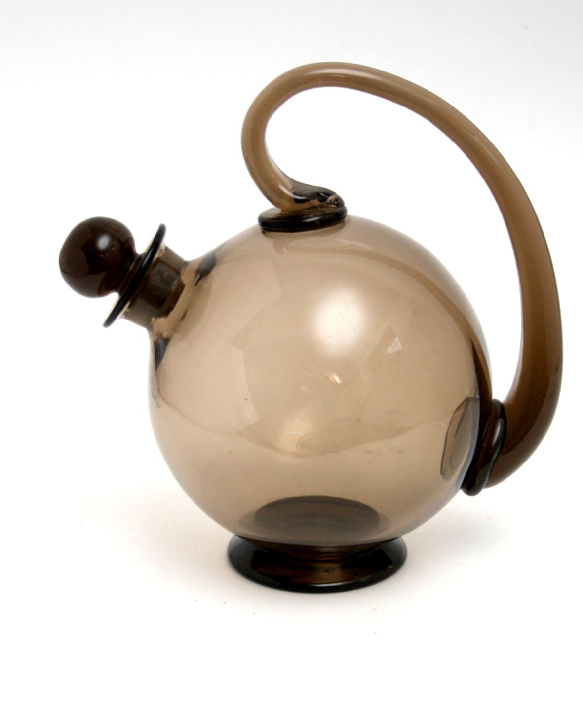 Holmegaard, Røgtopaz likørkaraffel af Jacob E Bang, fra 1930. Har et afslag indvendig nederst på proppen. Letter brugsridser. Højde 19 cm. Længde 18 cm. Pris: SOLGT