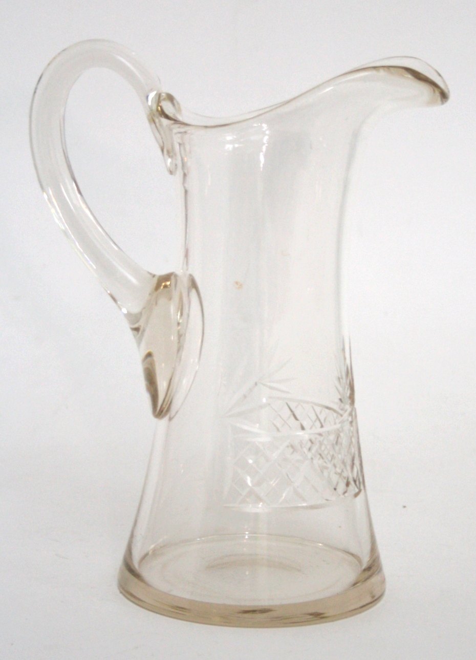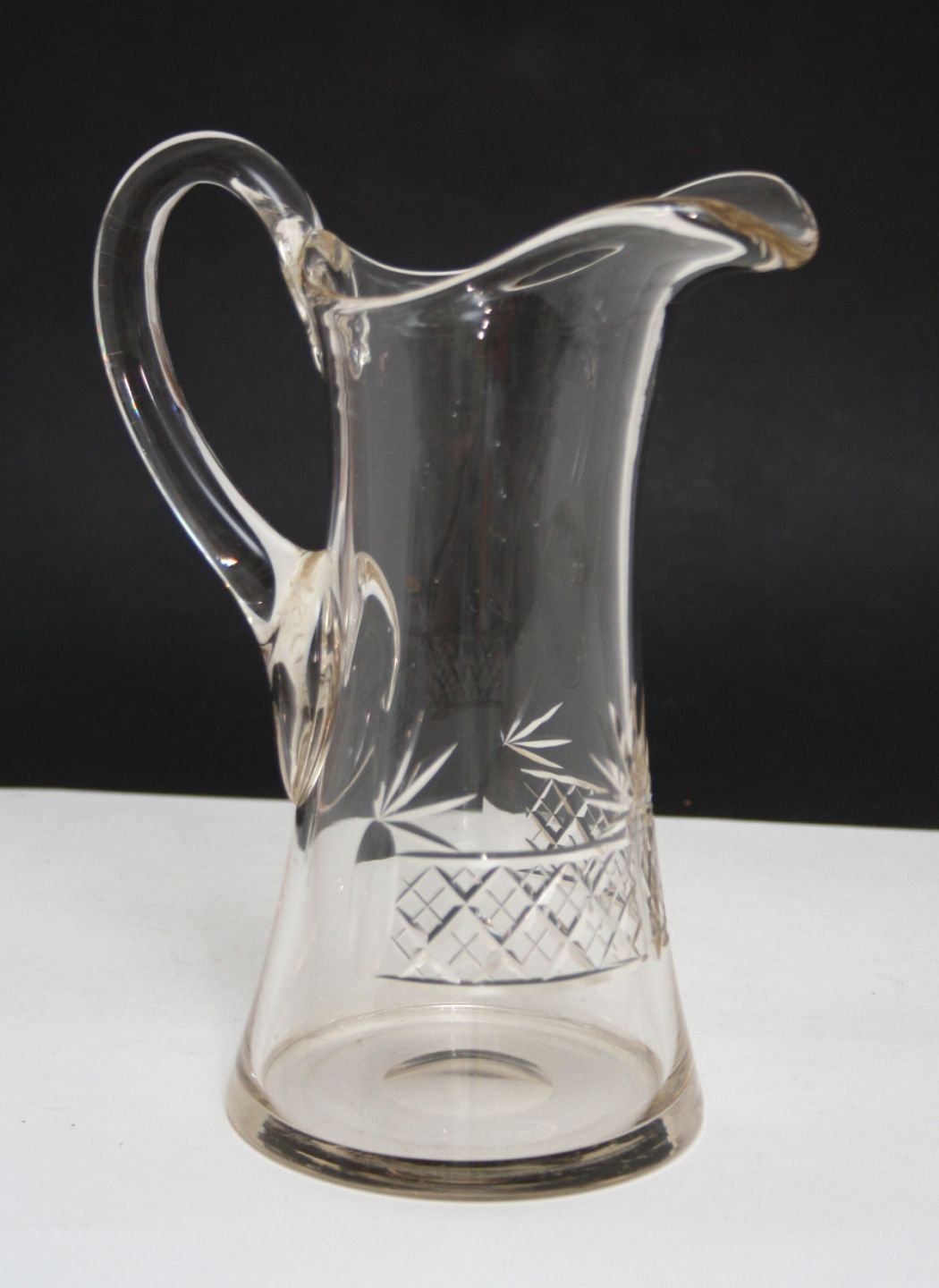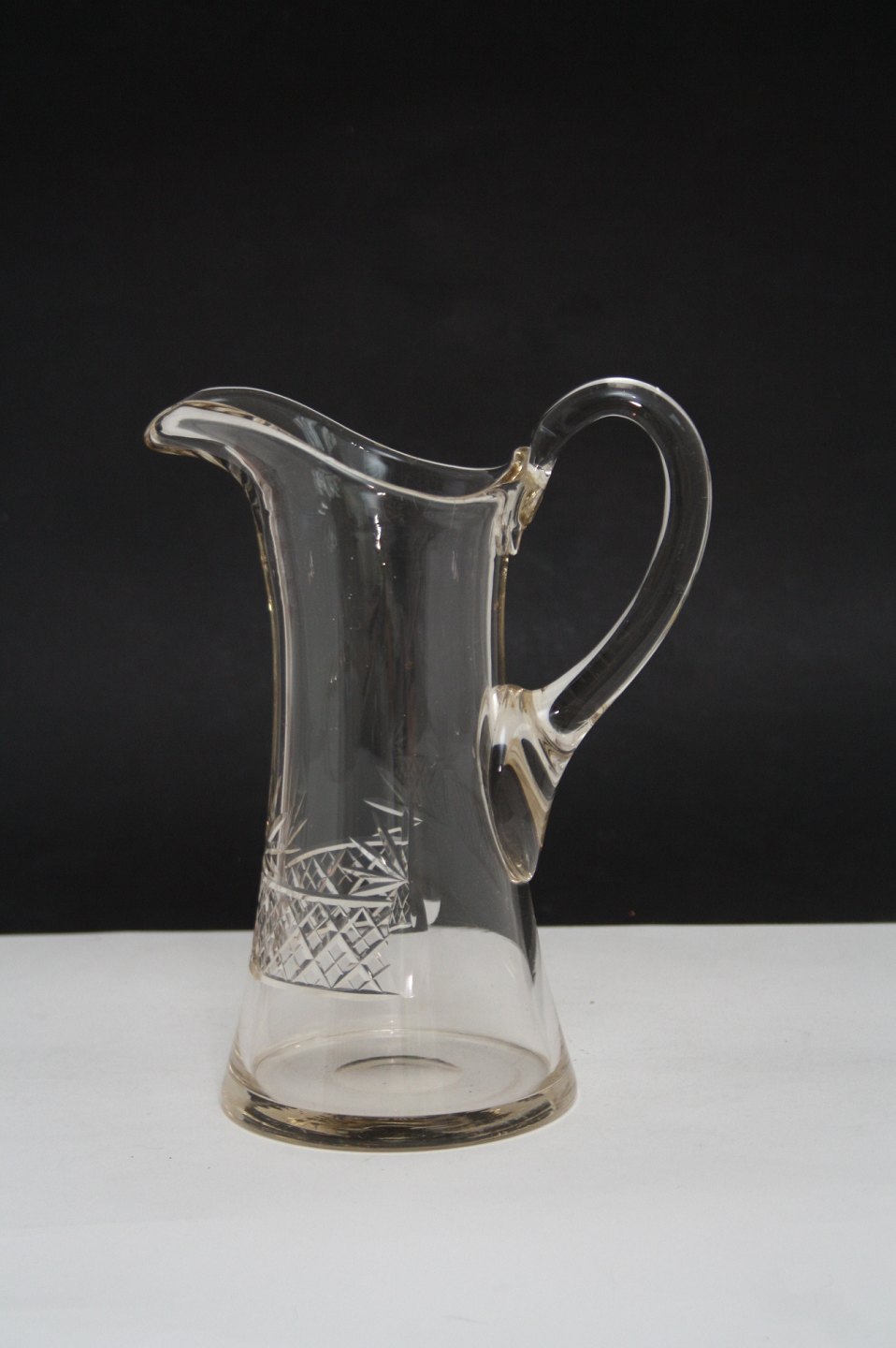 Glaskande med krydsslibninger rundslebet i bund. Højde 20,5 cm. Afslag ved hank. Pris: 225 kr.