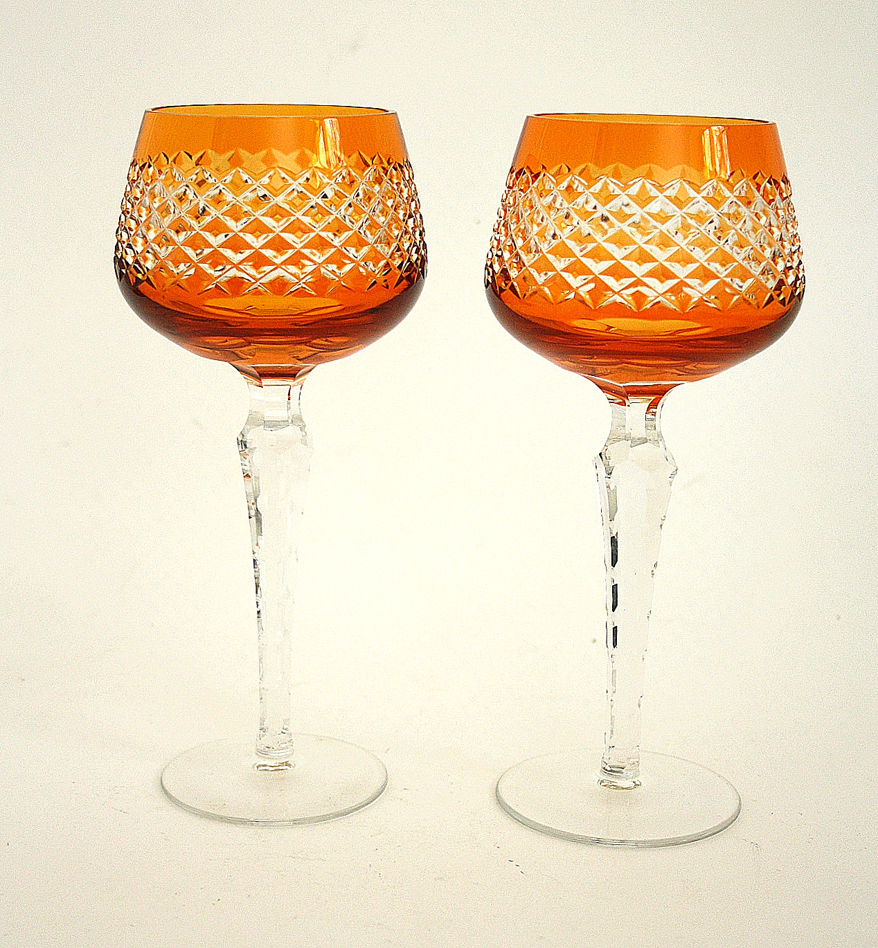 Bøhmisk krystal, vinglas med slibninger på kumme og stilk. Højde 20 cm. Pris: 225 kr. stk. Orange. Lager: 2
