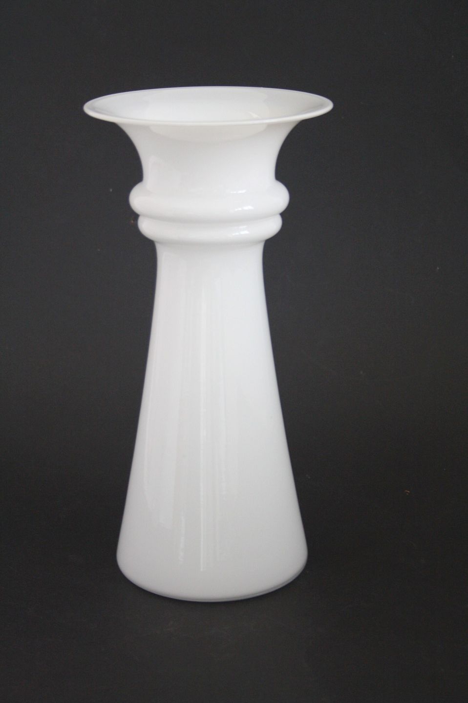 Holmegaard, Harmony opalinehvid vase designet af Michael Bang i 1989. Højde 28 cm. Pris: 400 kr. stk. Lager: 2