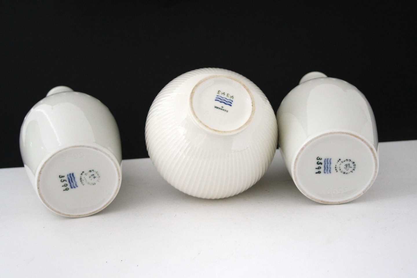 T.v. og t.h. Vase med motiv på kraven. Formnr. 3599. Højde 16,5 cm. I. sortering. Pris: 275 kr. stk. Lager: 1