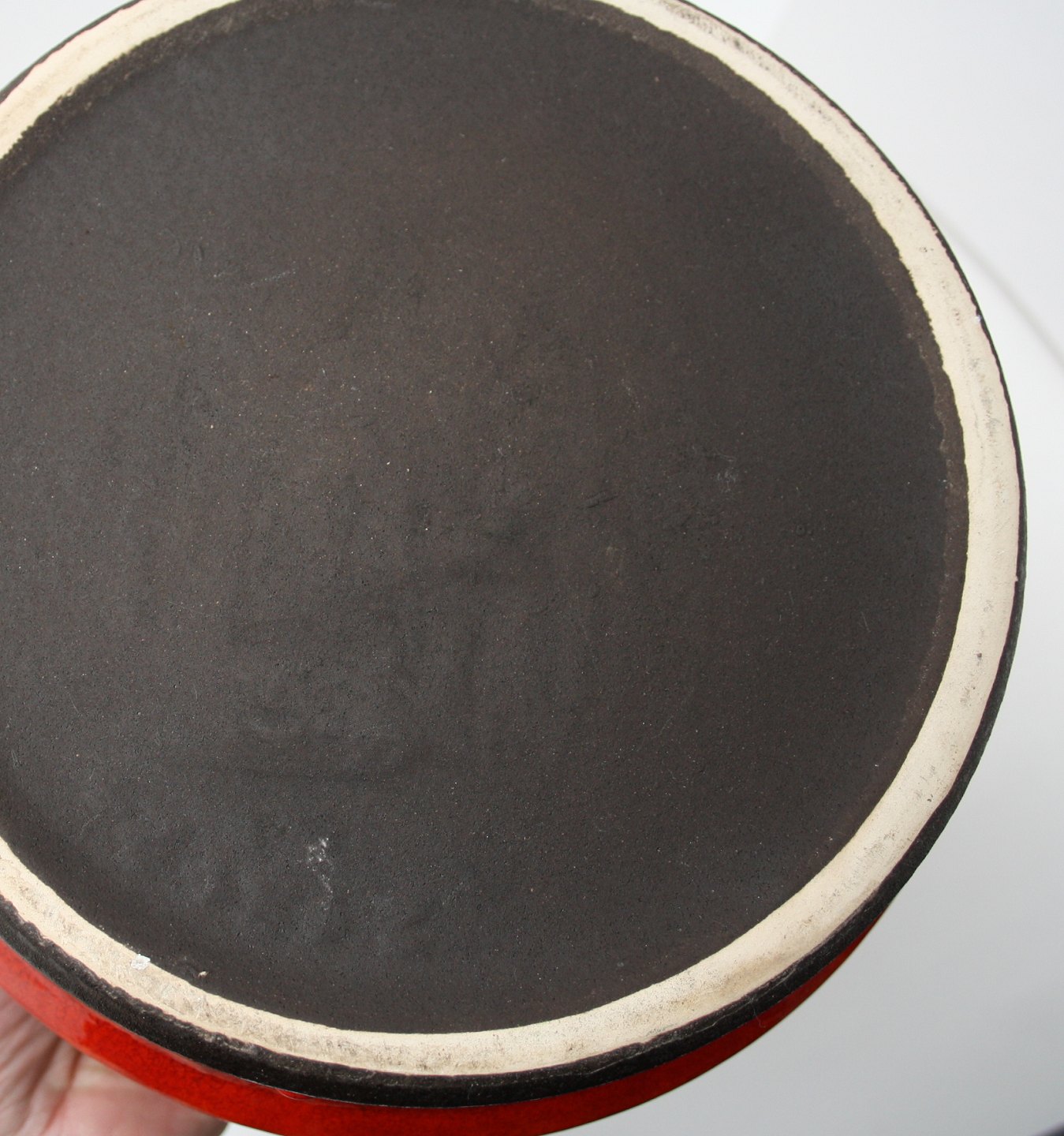 Jasba, West Germany stor skål med orange løbeglasur og mat sort glasur indvendig. Højde 11 cm. Diameter 24 cm. Pris: 400 kr.