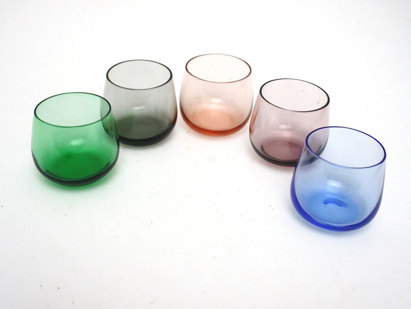 Farvede likørglas. Højde 5,5 cm. Øverste diameter 5 cm. Pris: SOLGT