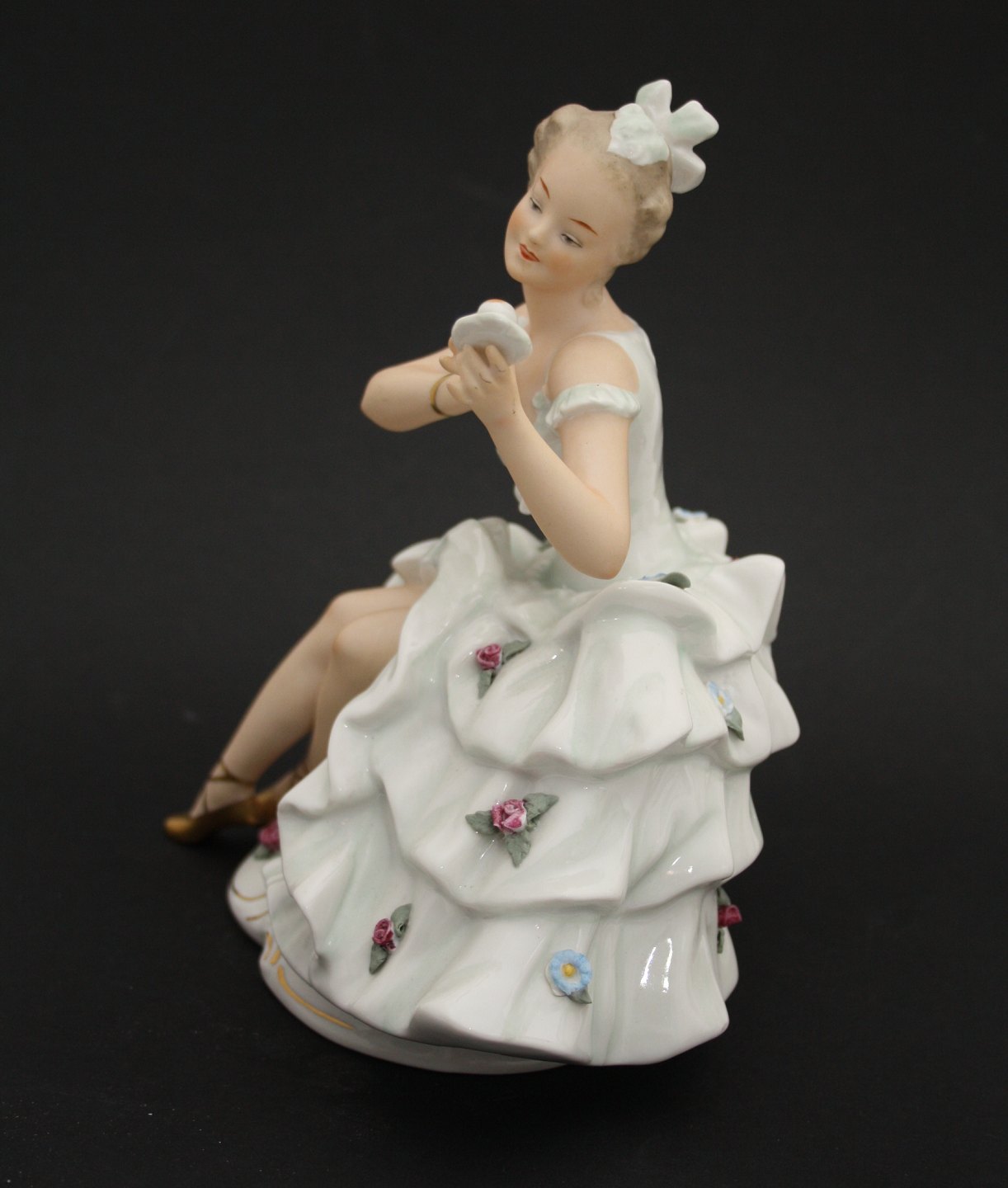 Wallendorf, Germany, Ballerina der sminker sig. Mærket W 1764 Germany. Kjole er glasseret, krop og hoved uglasseret. Påsatte blomster på kjolen. Højde 20,5 cm. Flot stand. Pris: SOLGT