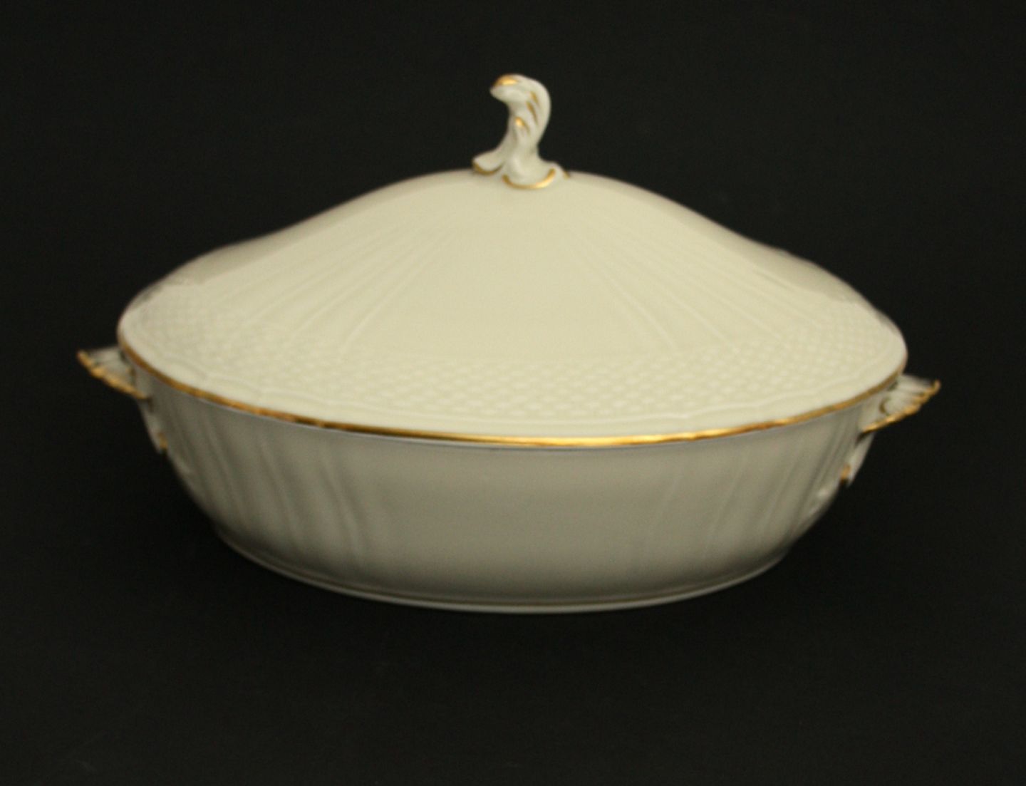 Aflang terrin med låg. Formnr. 1702. Længde 27 cm. Bredde 18 cm. Højde 15 cm. Pris: 475 kr. stk. Lager: 1