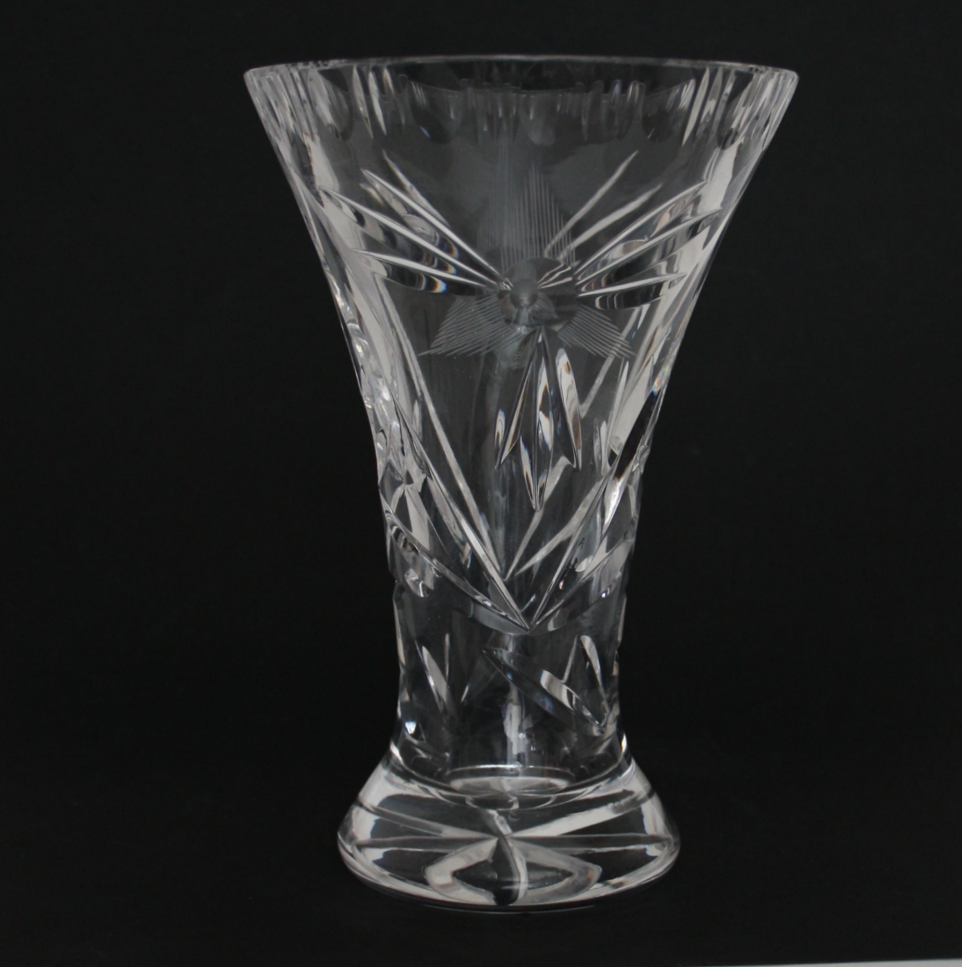 Vase i klar slebet glas. Højde 21 cm. Diameter 14 cm. Vægt 1,5 kg. Pris: 200 kr.