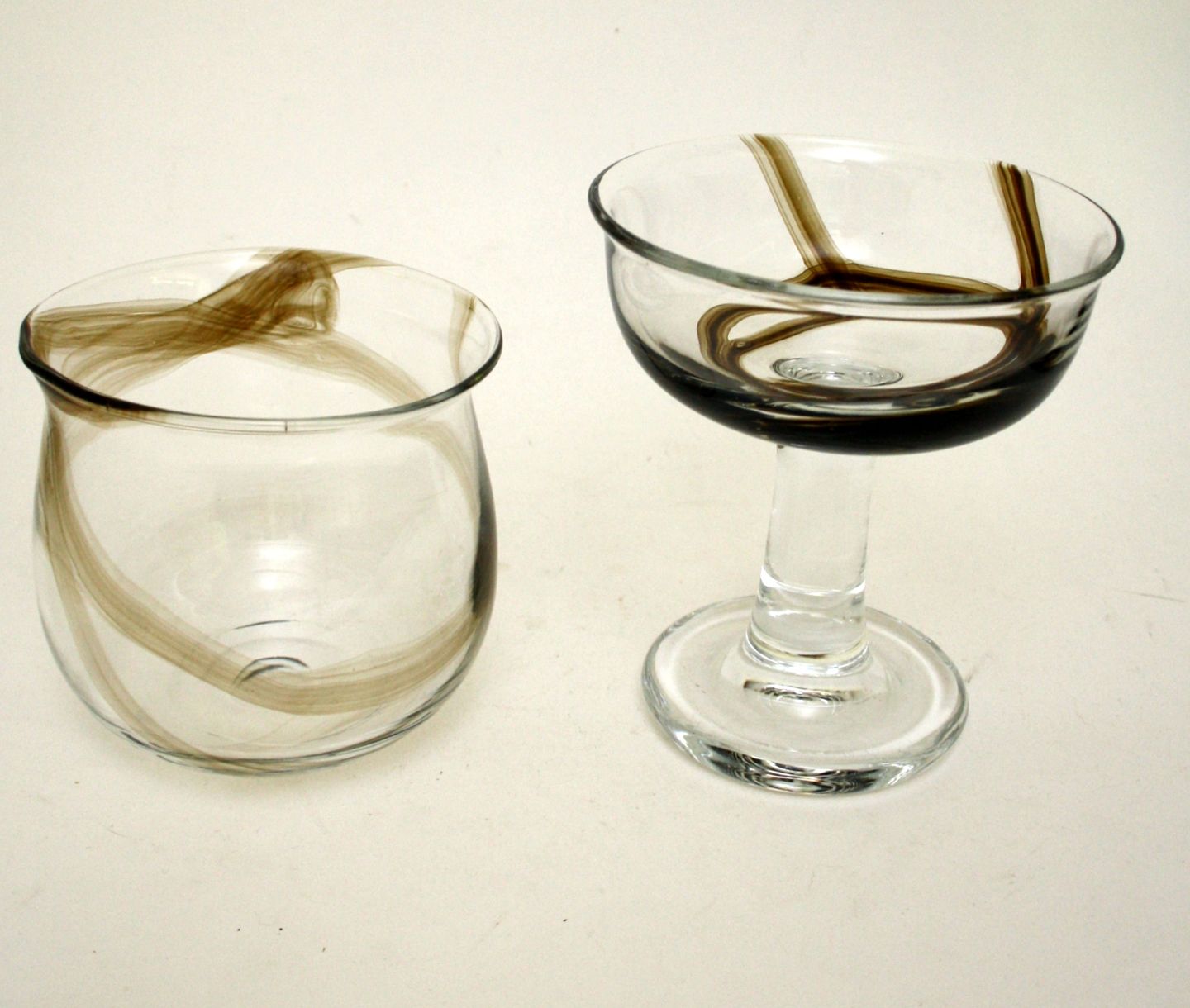 Holmegaard, Tundra glas med sortbrune penselstrøg designet af Michael Bang. Skål fra 1978. Højde 11,5 cm. Diameter 13 cm. II sortering. Pris: 275 kr. Opsats fra 1979. Højde 16 cm. Diameter 14,5 cm. II sortering. Pris: 275 kr.