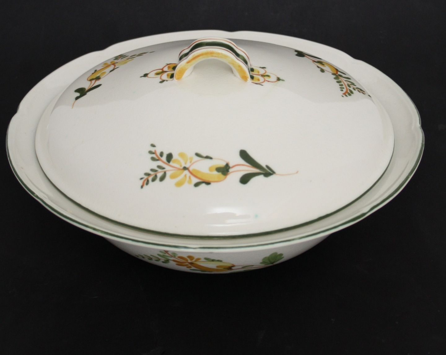Aluminia, Maj fra 1940-66 håndmalet, kunstner Niels Thorsson. Kartoffelskål med låg. Diameter 25,5 cm. Højde 13,5 cm. Lettere overflade krakeleringer. Pris: SOLGT