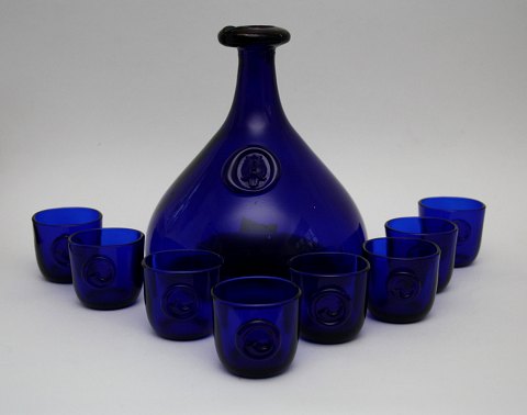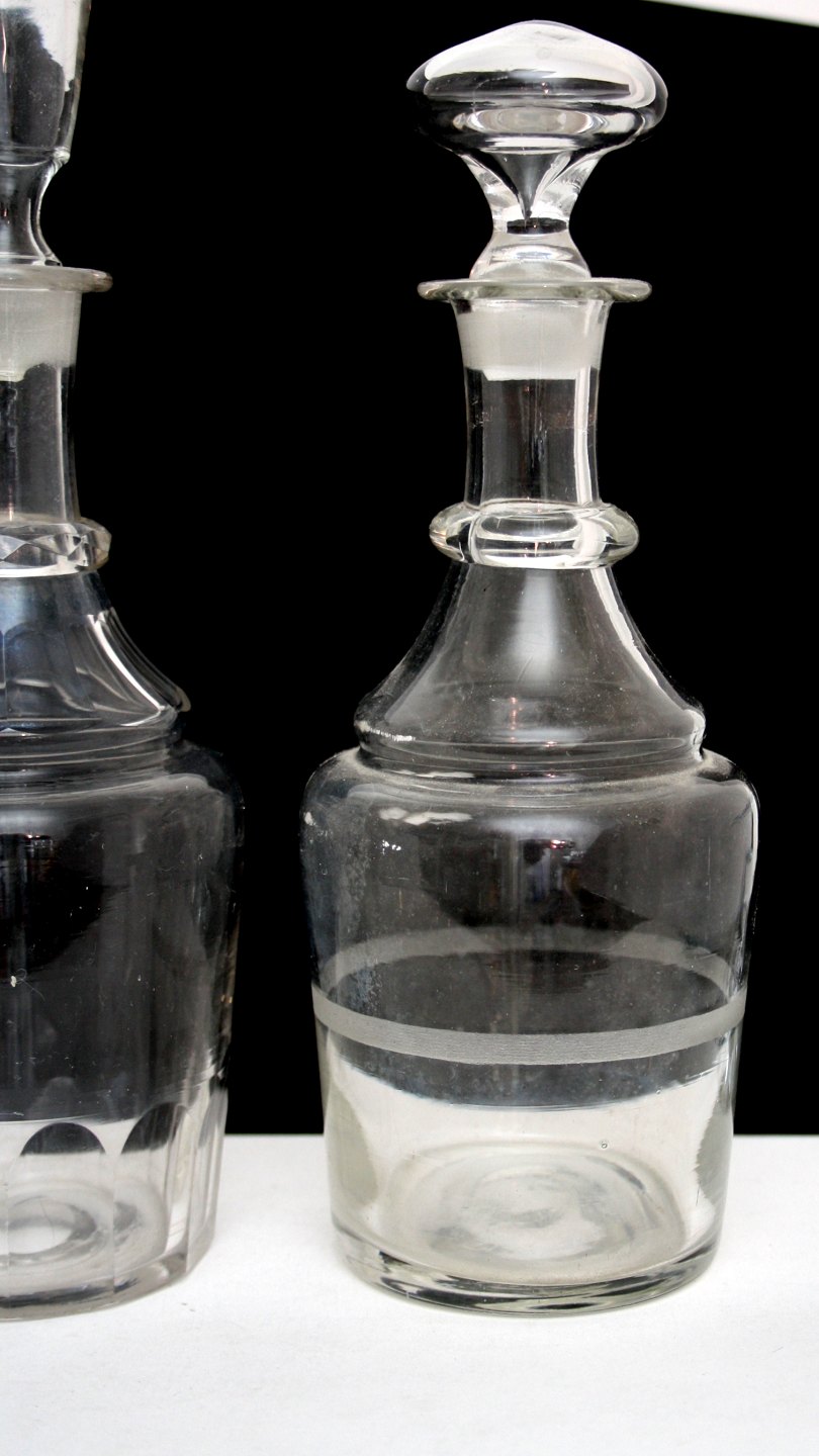 Nr. 1 fra venstre. Karaffel med oliveslibning for neden og på hals, slebet rigel. Lille afslag på prop. Proppen er luft tom. Rundslebet i bund. Højde 22 cm. Pris: 275 kr.