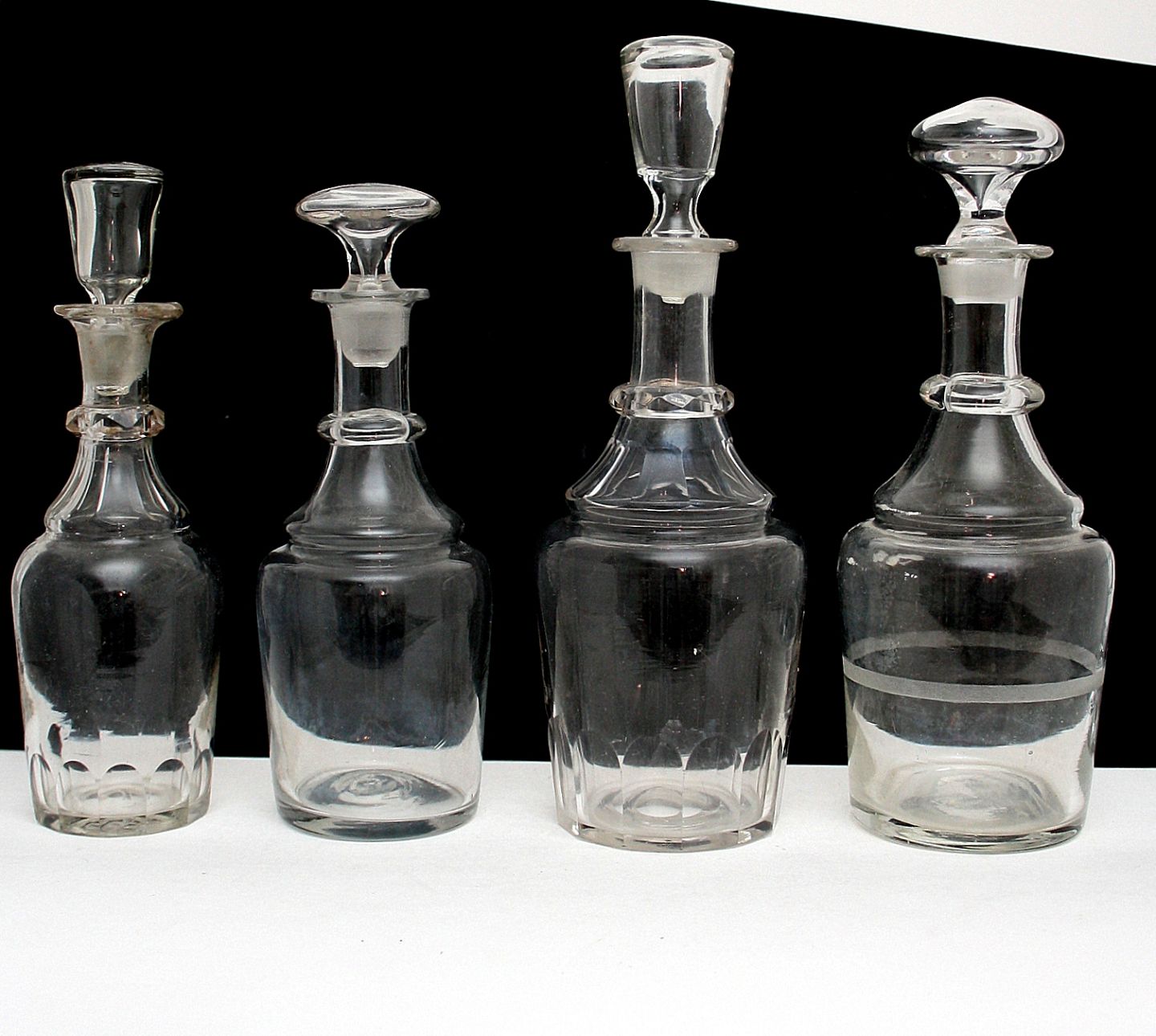 Gamle karafler i klar glas. Alle pæne i forhold til den alder de har, almindelig brugsslid.